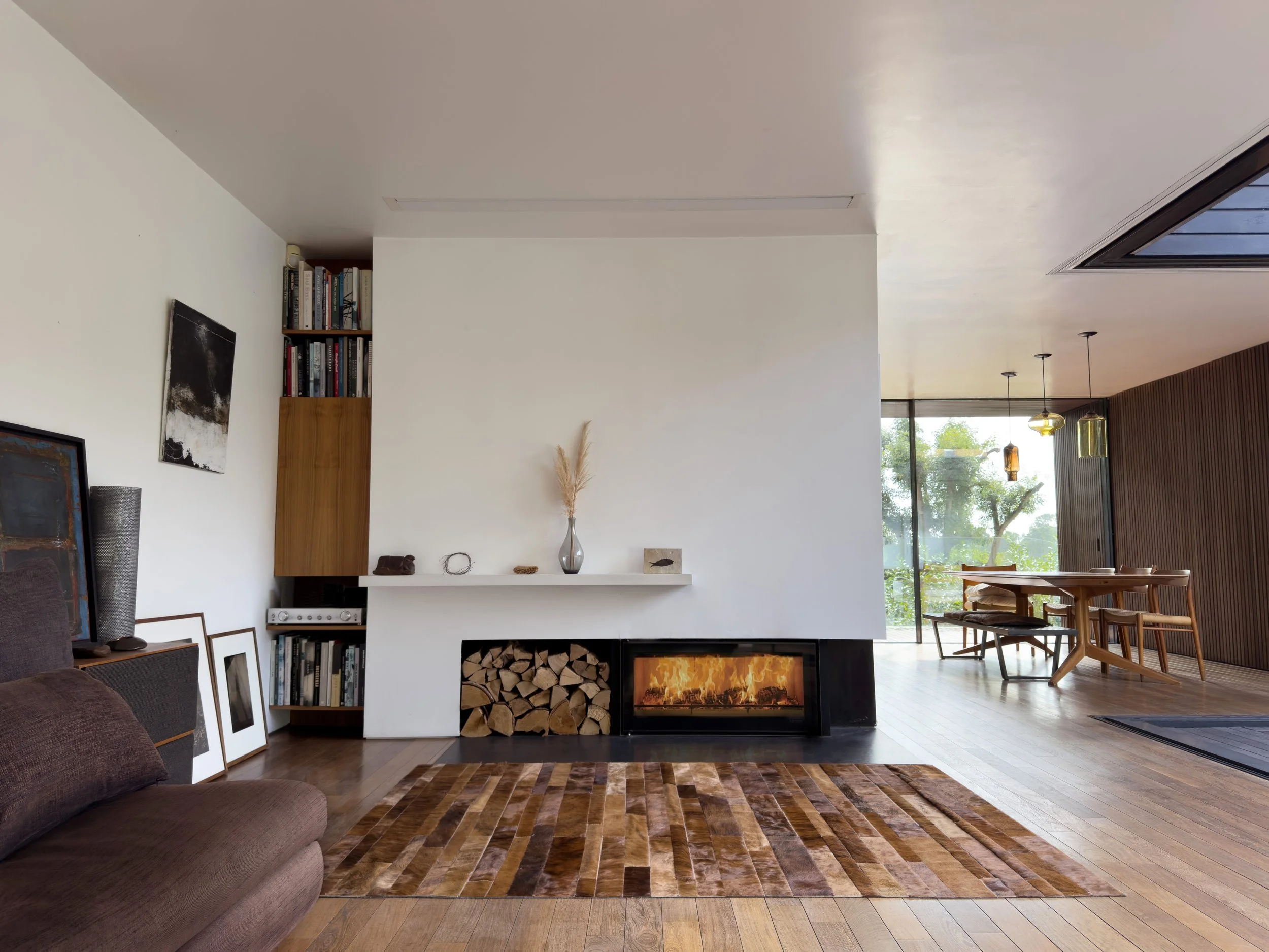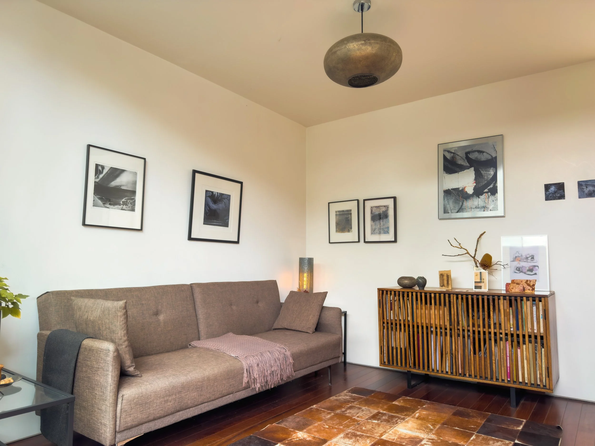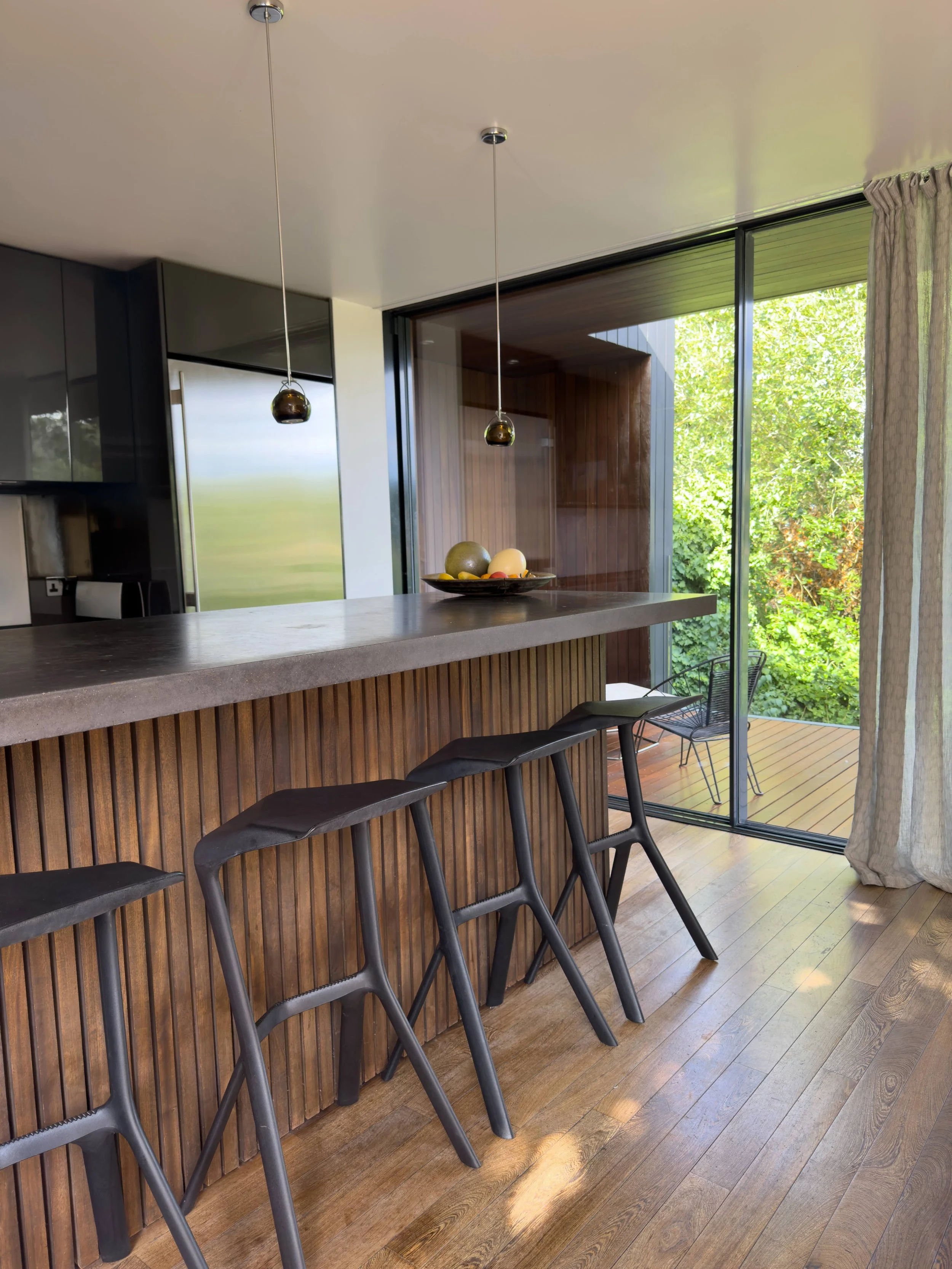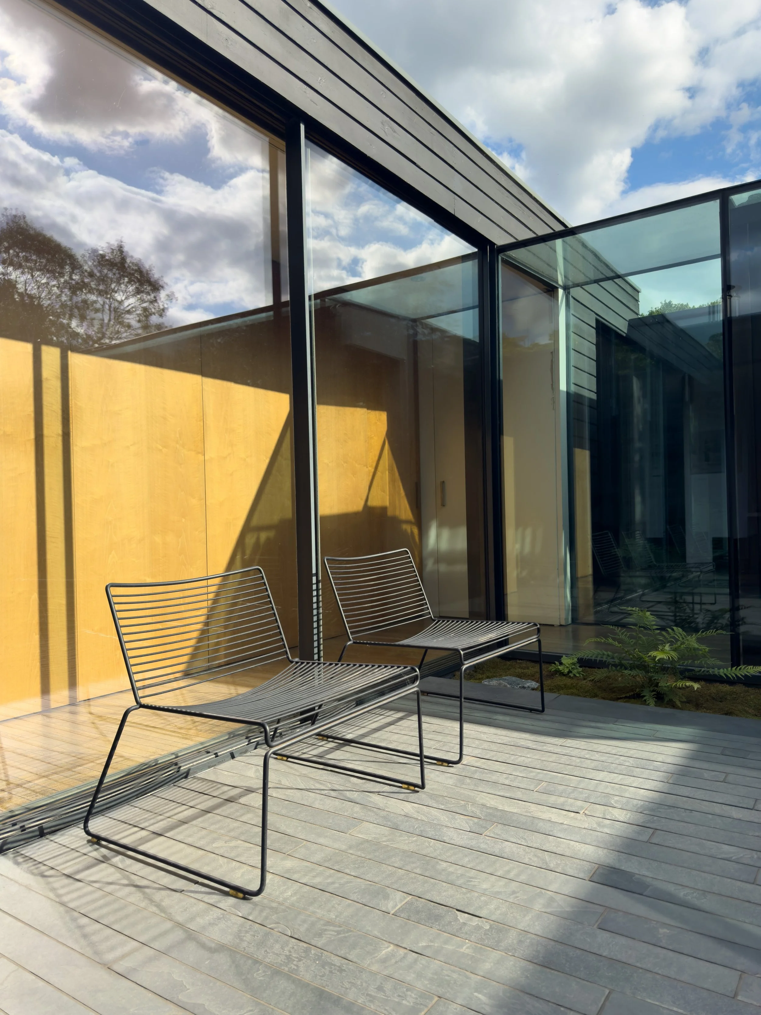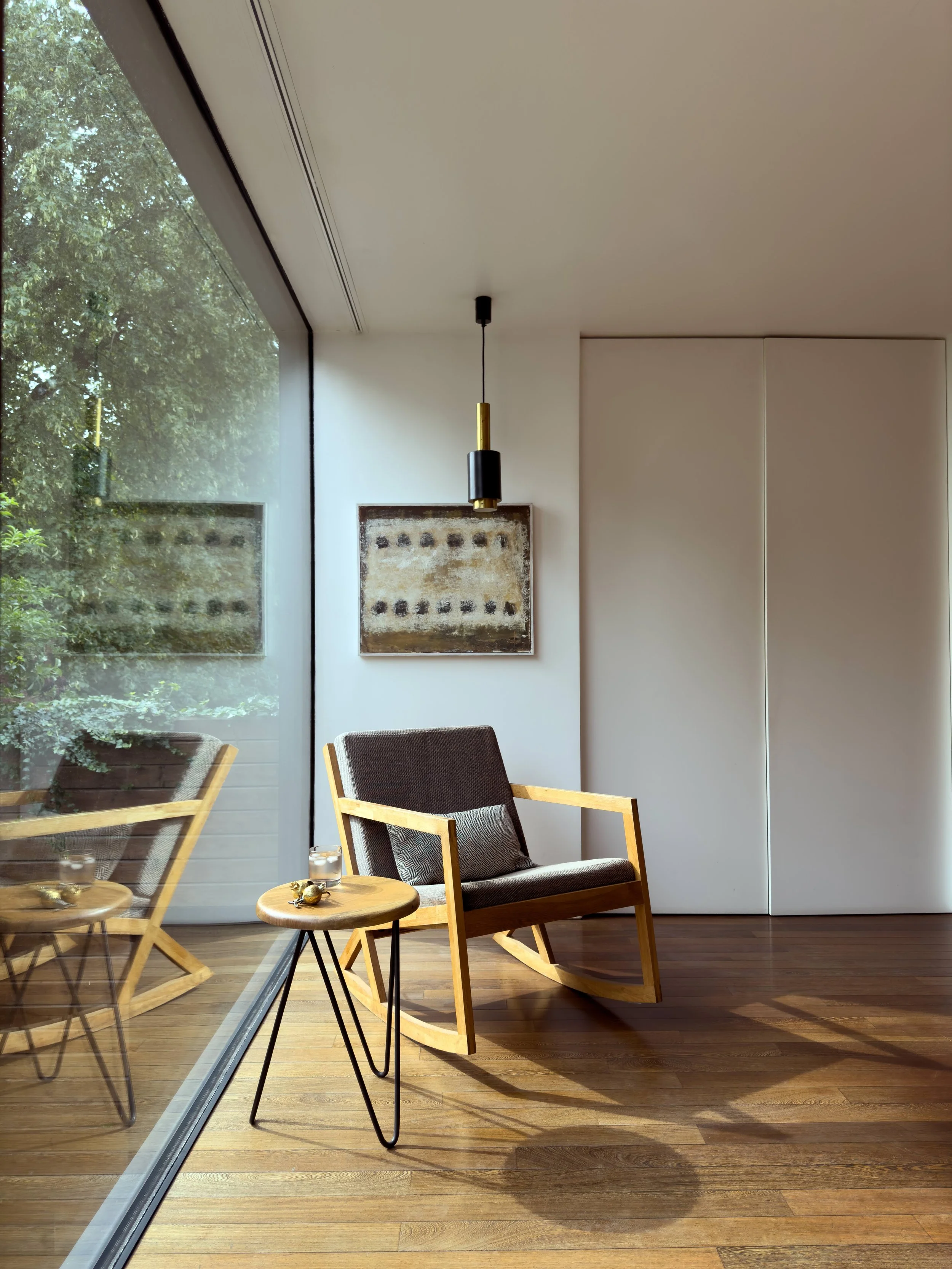A beautiful inside/outside location which features a sleek wood burner, high end kitchen, moss garden, balcony and tree-scape views. There is a fine selection of modern and mid century furniture, light fittings and accessories as well as a good collection of modern art.