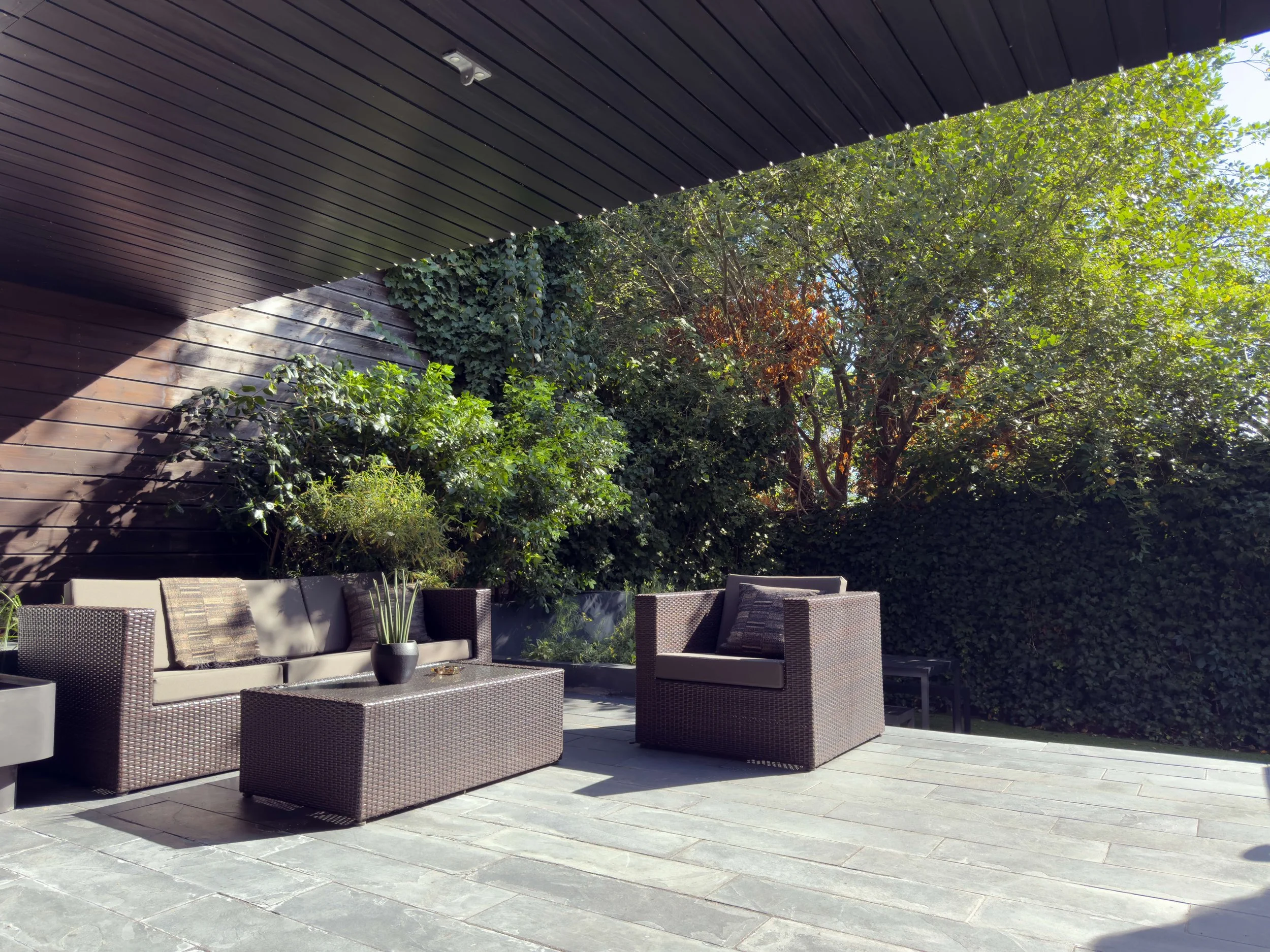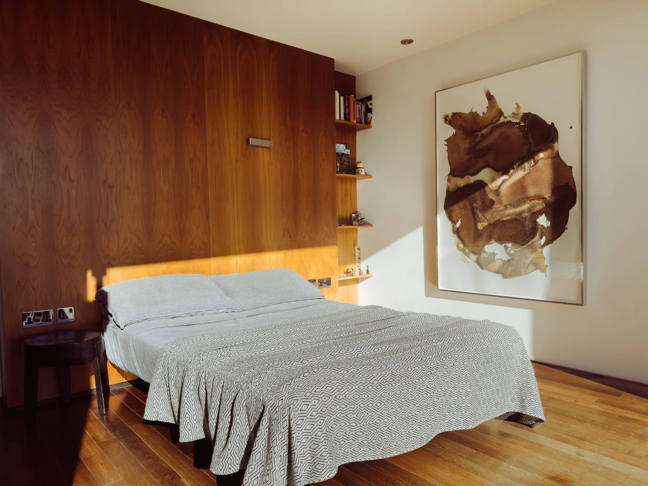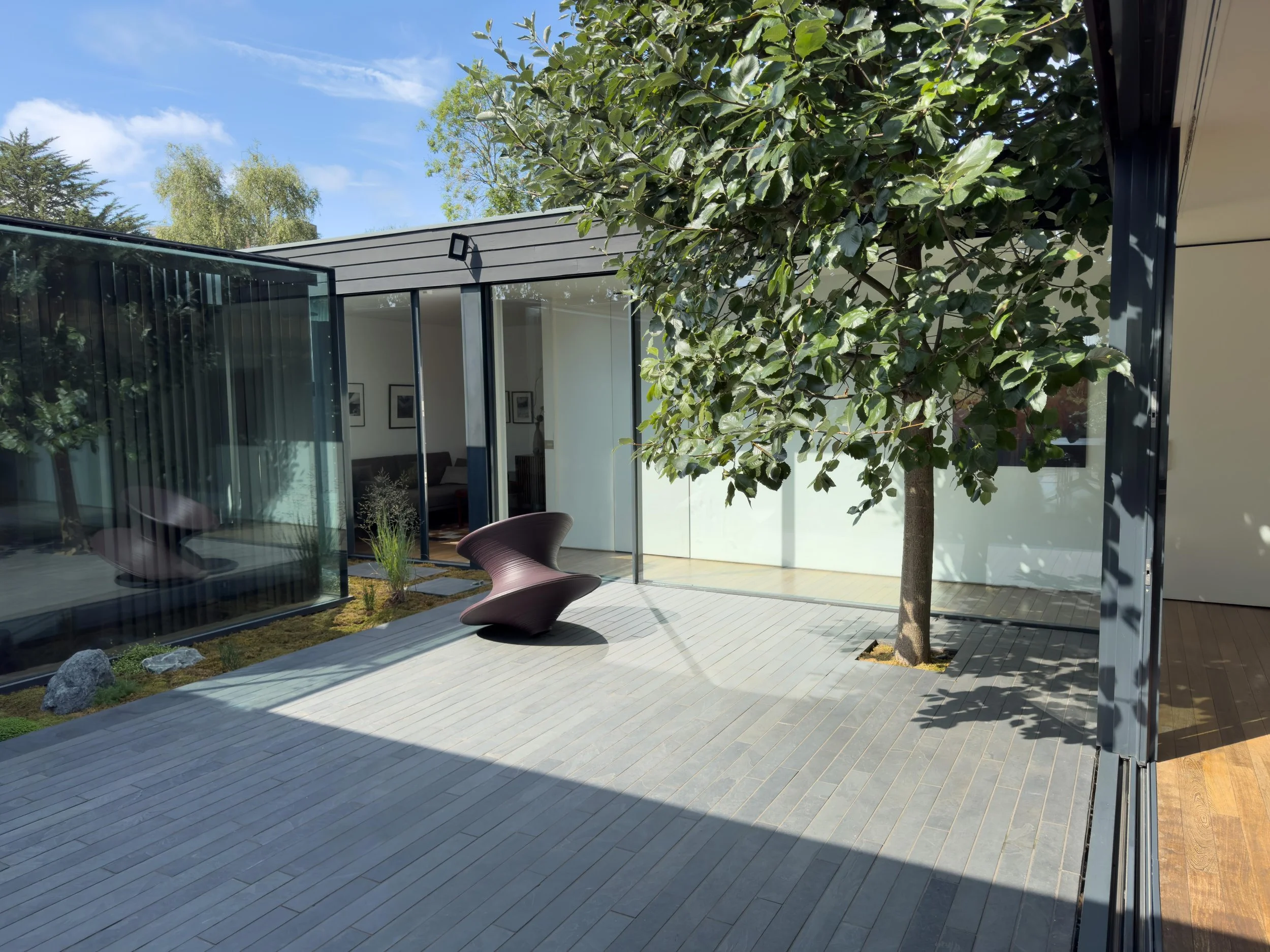 Modernist, North London House which wraps around a light-filled internal courtyard. The pared back lines of the floor-to-ceiling glass are balanced by walnut panelling, feature walls and natural materials.